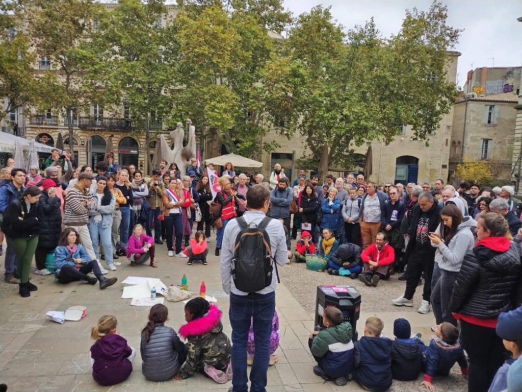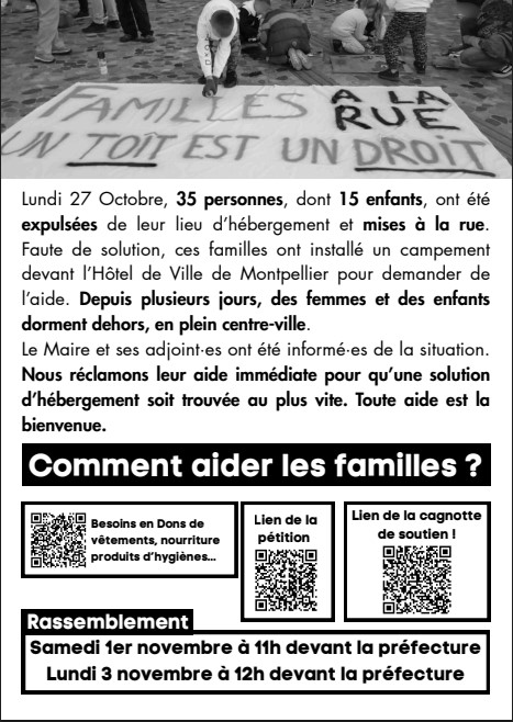 – vous pouvez aussi passer rencontrer les familles, lire une histoire, jouer d’un instrument, échanger quelques paroles, et juste mettre des visages sur ces personnes. Les têtes nouvelles montrent aux familles que le combat prend de l’ampleur et leur donnent du courage. Et soulagent celles et ceux qui dorment si peu depuis lundi. Elles permettent aussi à nous, citoyens, d’humaniser et de concrétiser le combat. Il ne faut pas négliger l’importance de passer simplement soutenir, échanger quelques mots, proposer une boisson chaude au cours de la journée. Le parvis est tellement grand qu’on peut avoir l’impression qu’il n’y a pas grand monde sur place. Et c’est un fait, 35 personnes qui ne souhaitent (et ne peuvent de toutes façons face au risque d’évacuation) pas prendre trop d’espace, ça ne remplit pas le parvis. Mais les familles sont bien là, tout au fond de la place, près de l’entrée de la mairie, et un passage est toujours bienvenu.